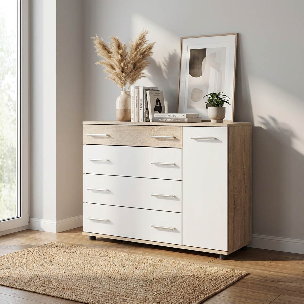Комод забезпечує зручну організацію зберігання завдяки поєднанню висувних ящиків і закритого відділення. Ящики підходять для білизни та одягу, а секція з дверцятами — для більш габаритних або рідко використовуваних предметів. Верхня поверхня може використовуватися для розміщення декору, дзеркала або повсякденних речей.
