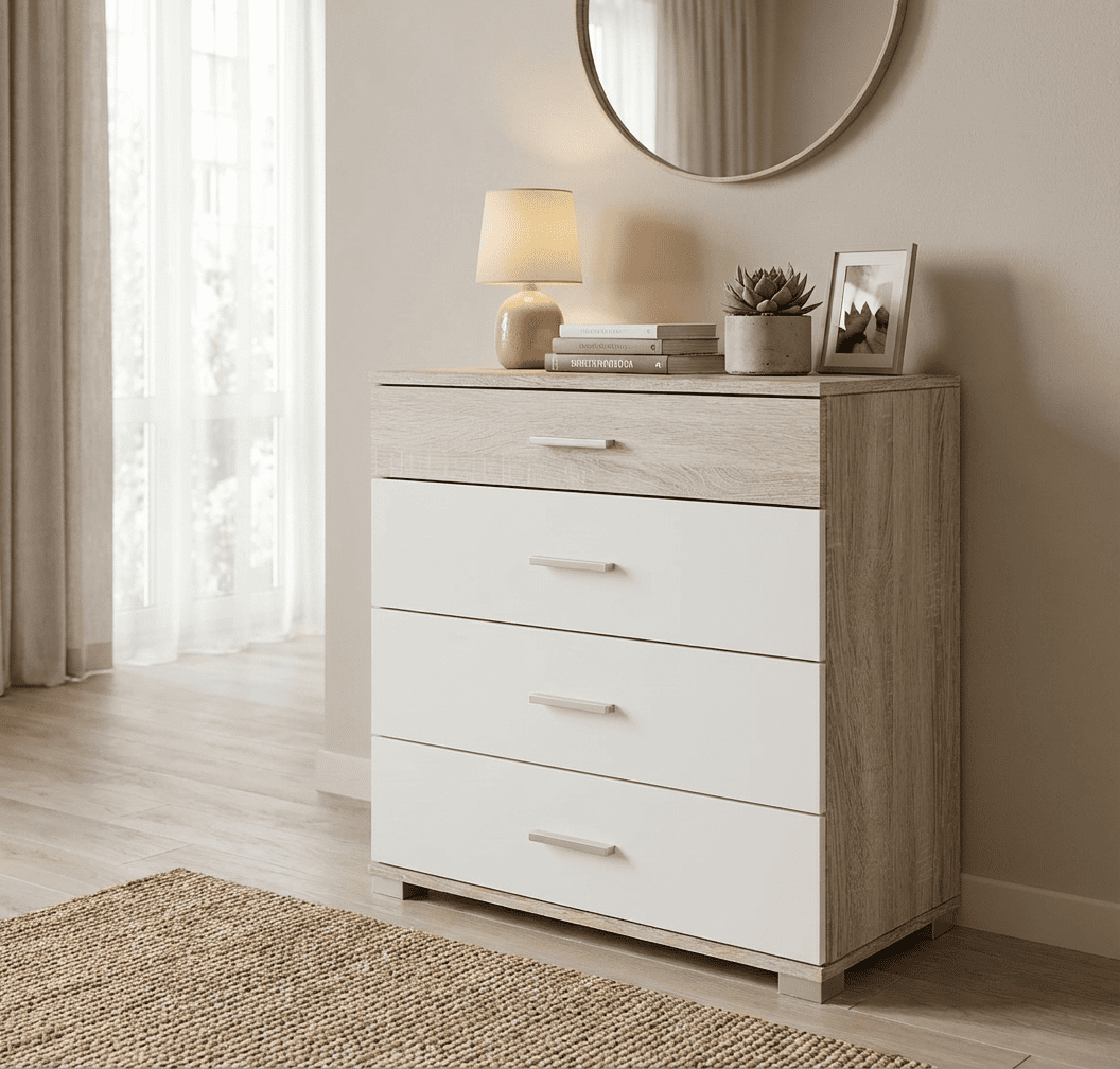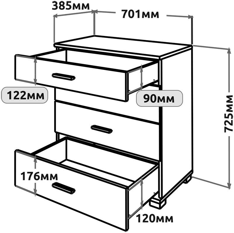 Комод оснащений трьома висувними шухлядами різної глибини, що дозволяє зручно зберігати одяг, білизну, документи та дрібні побутові речі. Продумана конструкція забезпечує легкий доступ до вмісту та раціональне використання внутрішнього простору.
