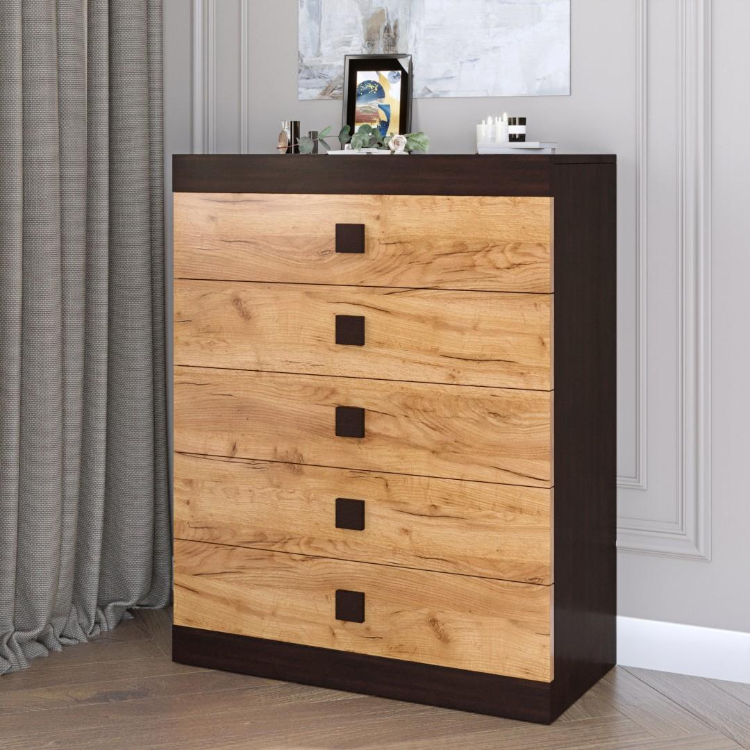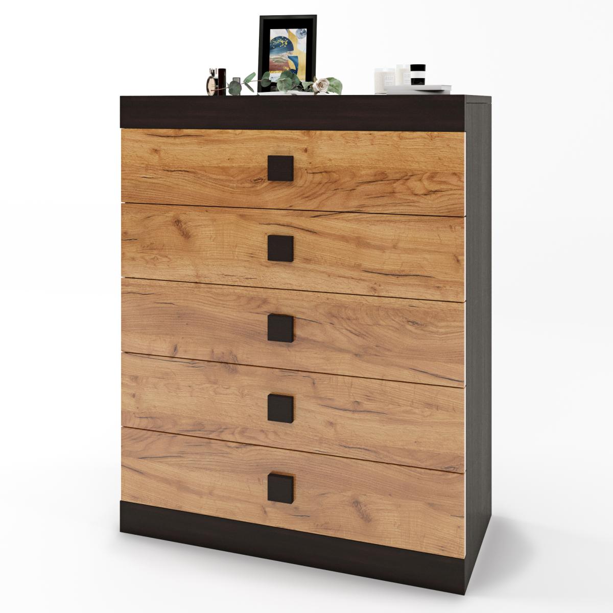 Комод 2 із колекції Соната – це стильний і зручний елемент меблів, який додасть інтер’єру нотку розкоші та забезпечить практичне зберігання речей. Завдяки компактним розмірам він допомагає економити простір, а п’ять містких шухляд дозволяють зручно організувати гардероб та аксесуари.