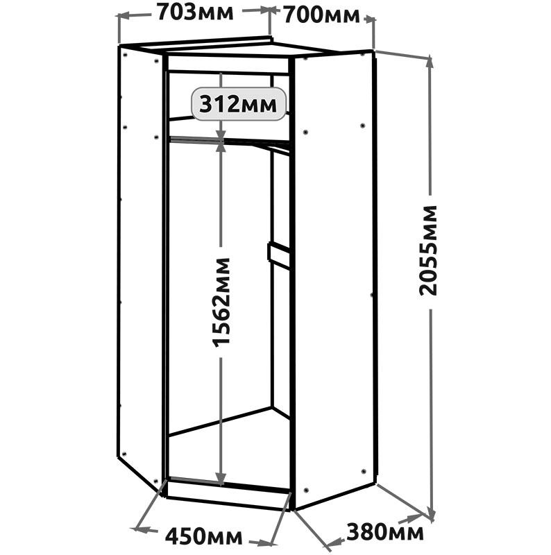 Кутова шафа EVEREST Соната 700 – це стильне й функціональне рішення для організації простору у передпокої, спальні або гардеробній. Компактні розміри дозволяють розмістити її навіть у невеликому приміщенні, а сучасний дизайн робить її універсальним елементом інтер’єру.