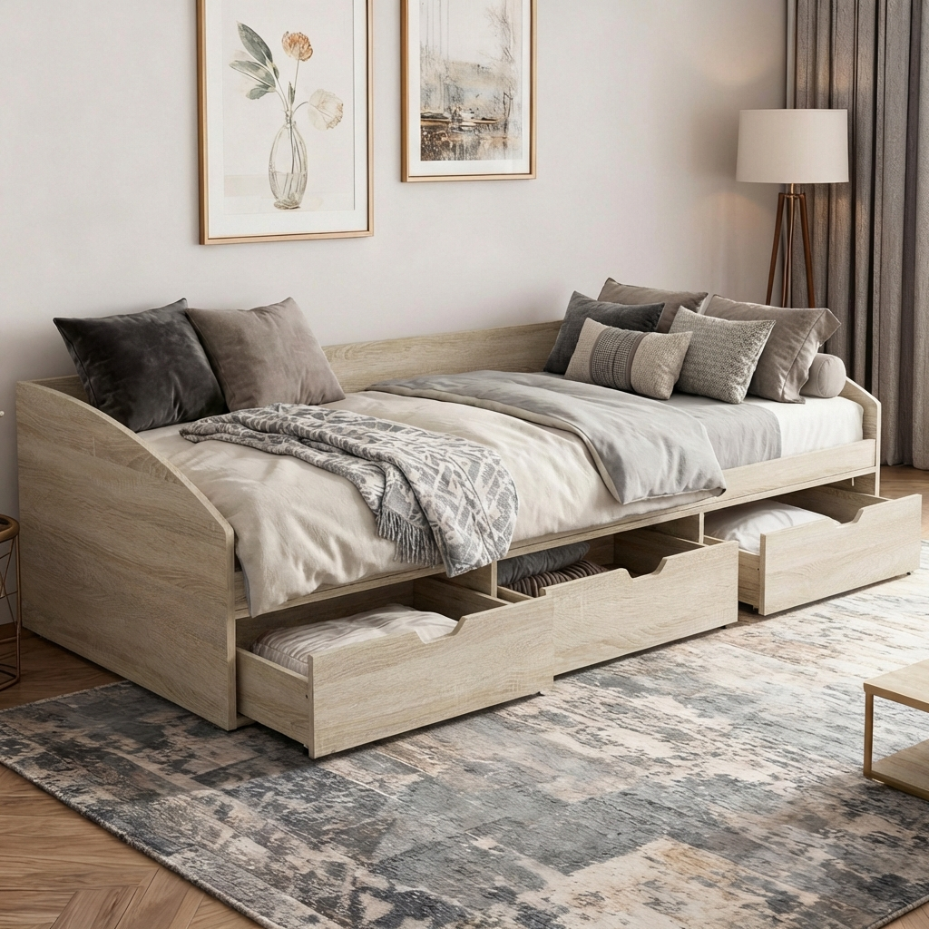 Ліжко оснащене висувними ящиками, що входять у стандартну комплектацію та підходять для зберігання постільної білизни, одягу або інших побутових речей. За потреби ящики можна замовити в інших доступних кольорах.