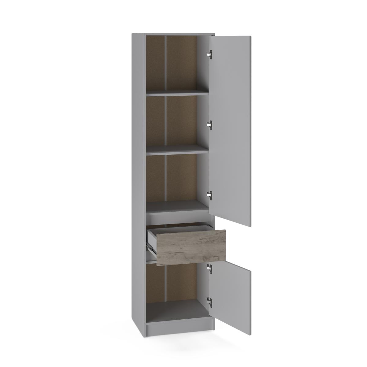 Пенал оснащений чотирма місткими полицями та одним висувним ящиком на телескопічних напрямних (глибина ящика — 120 мм), що ідеально підходить для зберігання документів, книг, білизни, одягу чи побутових дрібниць. Полиці різної висоти (393, 381, 386, 384 мм) дозволяють розміщувати як великі, так і дрібні речі. Нижній відсік із дверцятами — зручно для зберігання особистих речей та підтримання порядку.