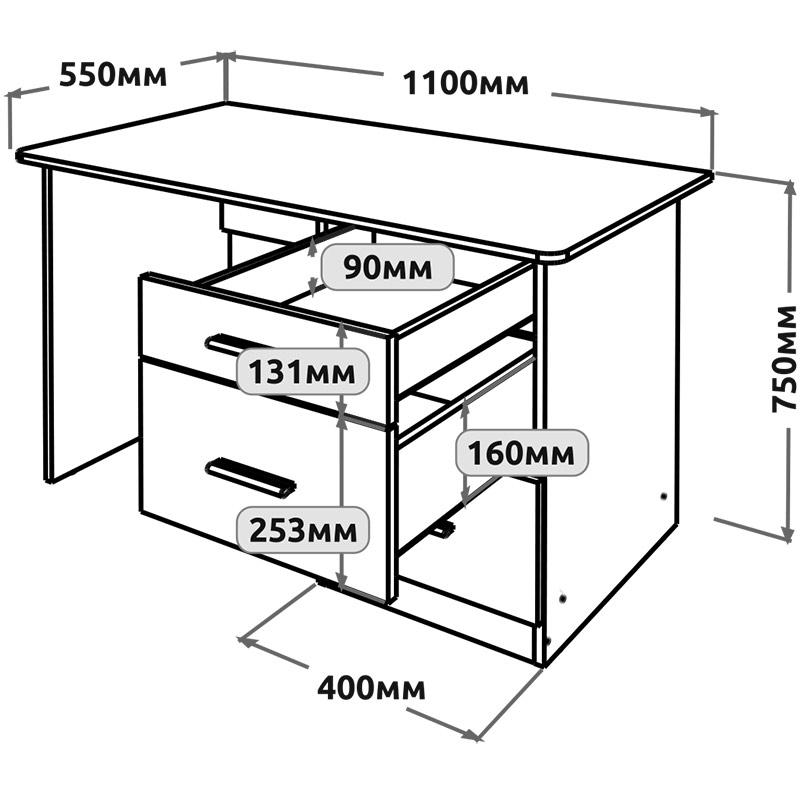 Стіл оснащений правою тумбою з одними дверима, за якими знаходяться дві полиці для зберігання книг, навчальних приладь або канцелярії. Додатково передбачений один висувний шухляда для дрібних предметів. Модель не має тумби під комп’ютер і полиці під клавіатуру, що залишає робочу поверхню максимально вільною.