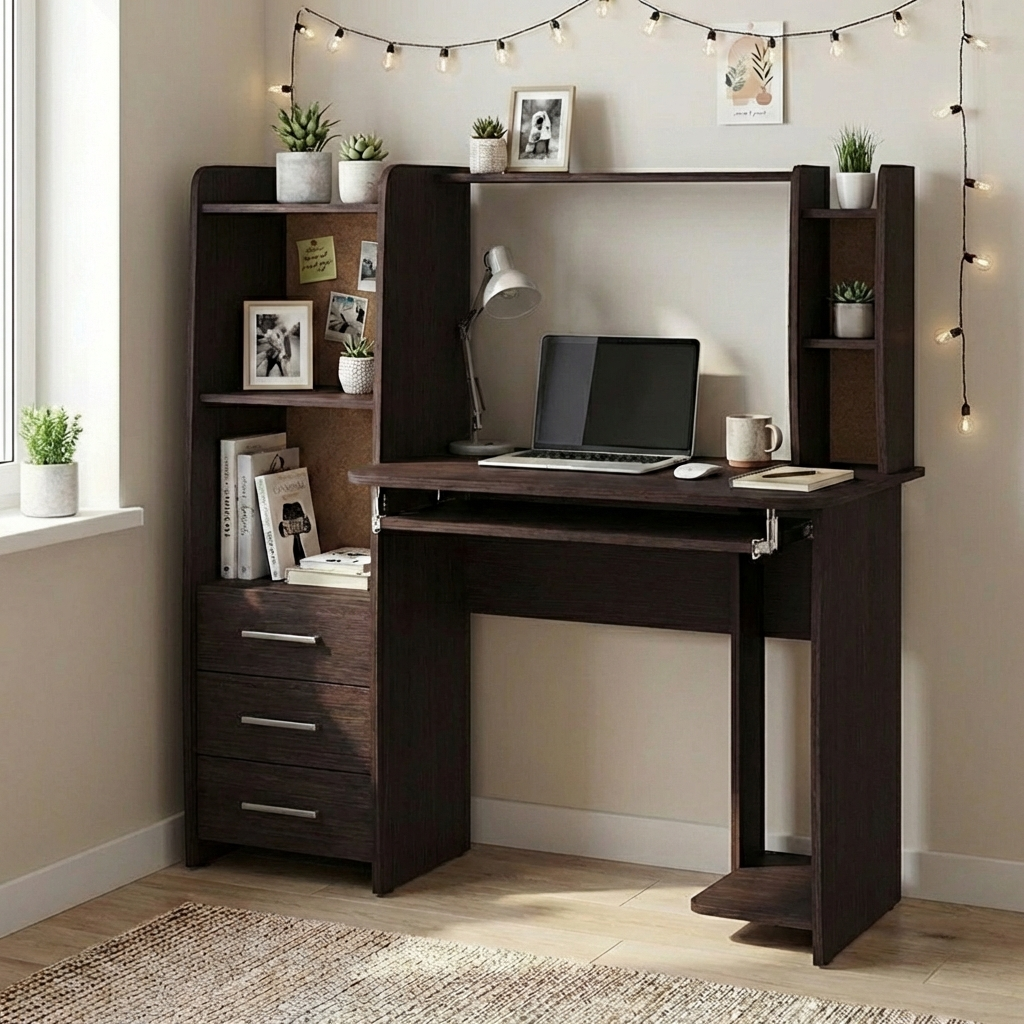 Письмовий стіл оснащений тумбою з висувними ящиками для канцелярії та документів, полицями в надбудові для книг і декору, а також просторою стільницею для комфортної роботи за комп’ютером або виконання навчальних завдань.