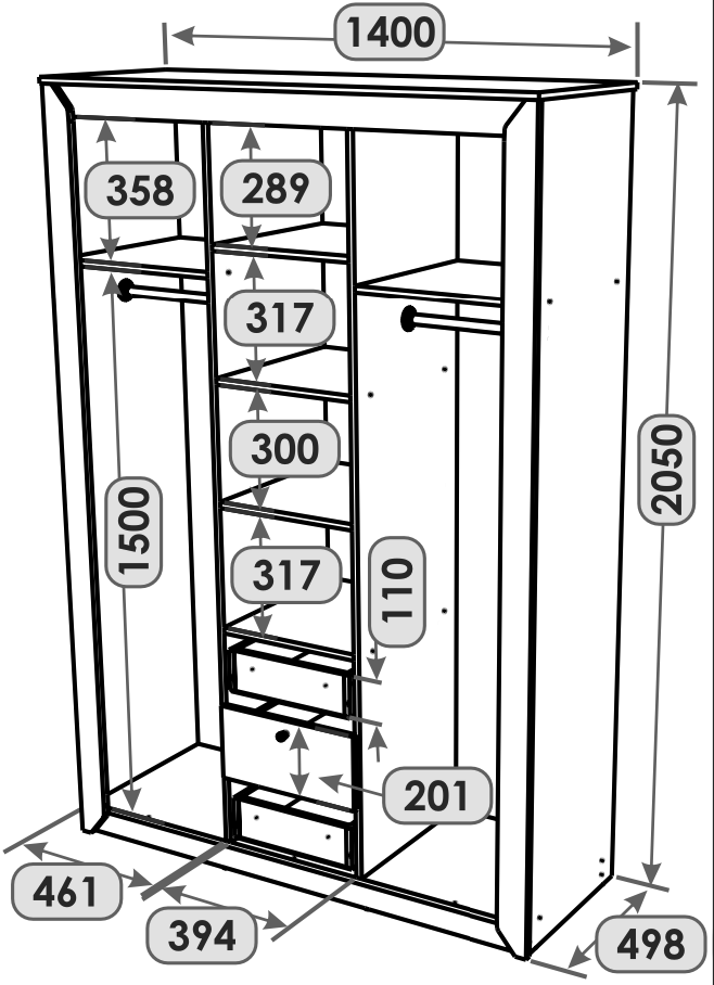 Ліва та права секції оснащені верхньою полицею та штангою для одягу.