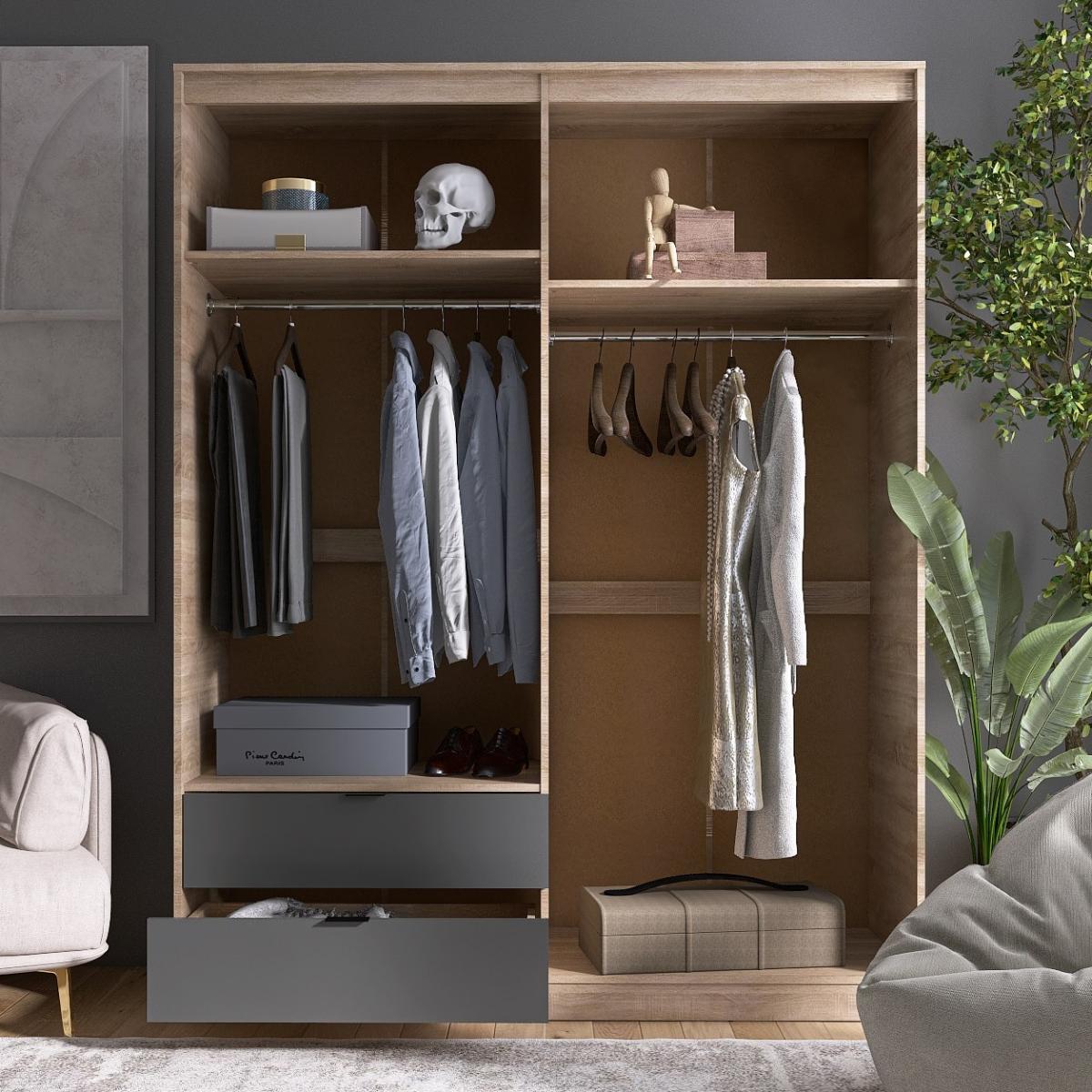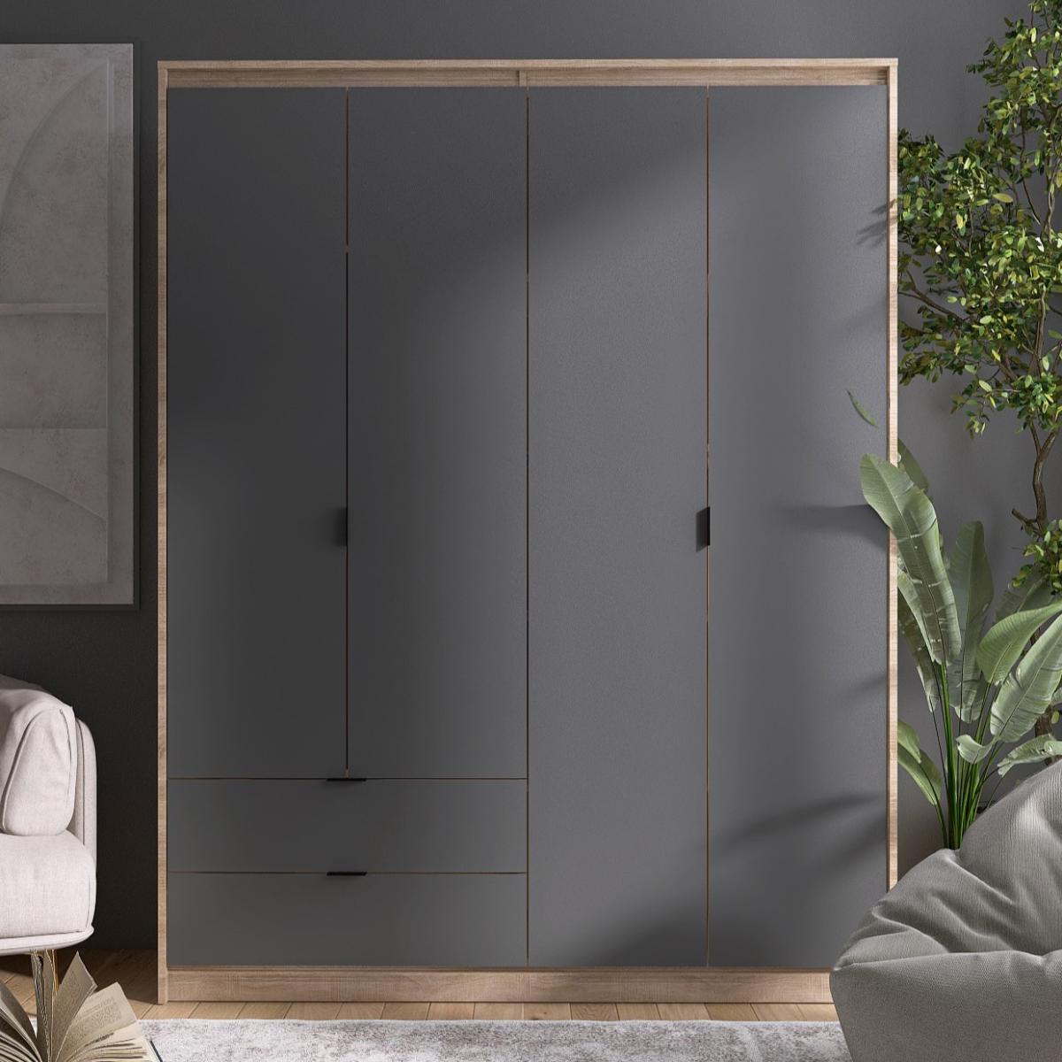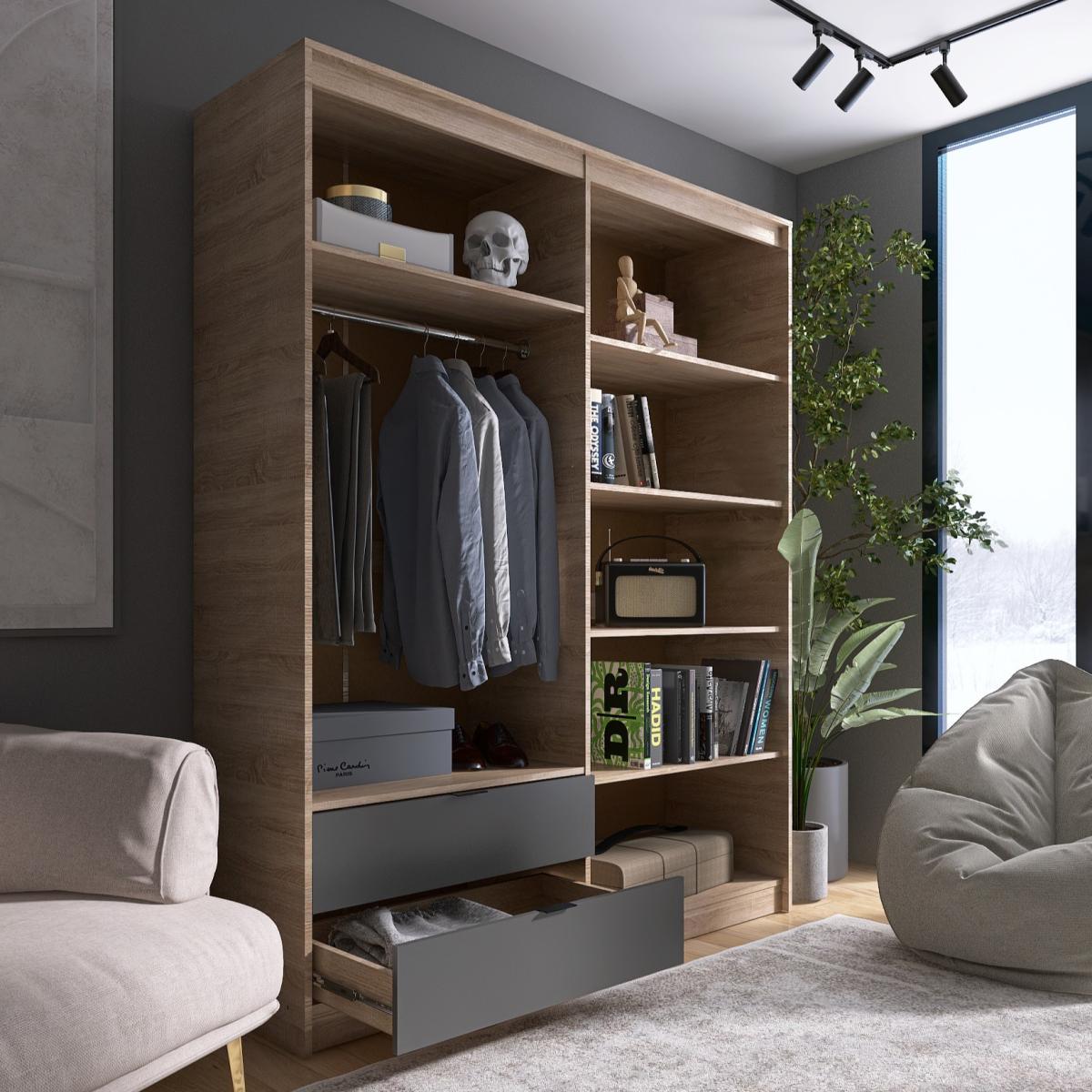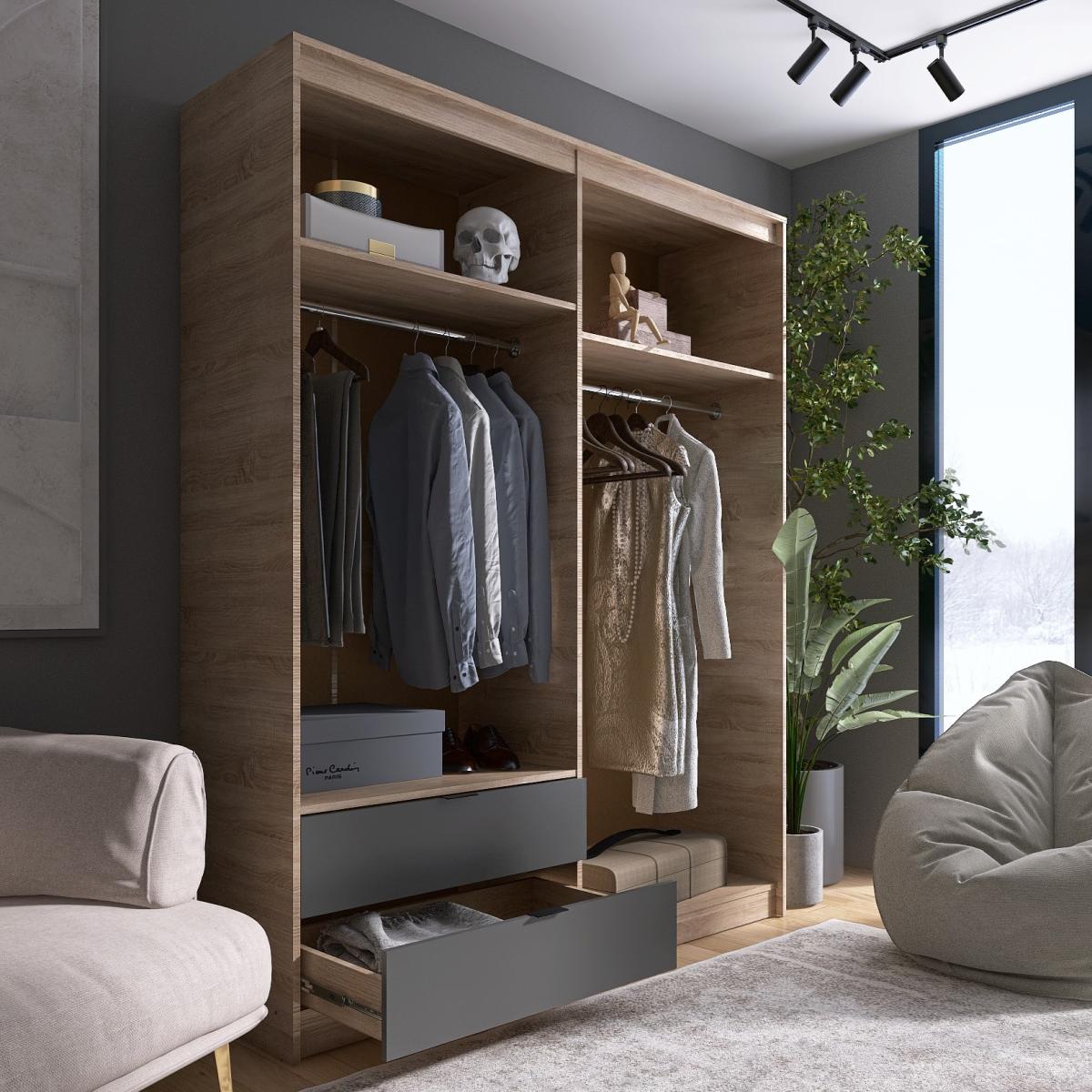 Шафа EVEREST Сіті 1600 — простора та функціональна шафа, створена для зручного зберігання одягу та аксесуарів у спальні, гардеробній або передпокої. Модель виконана у елегантному поєднанні корпусу кольору Сонома та матових фасадів в кольорі графіт, що забезпечує стильний і сучасний вигляд.