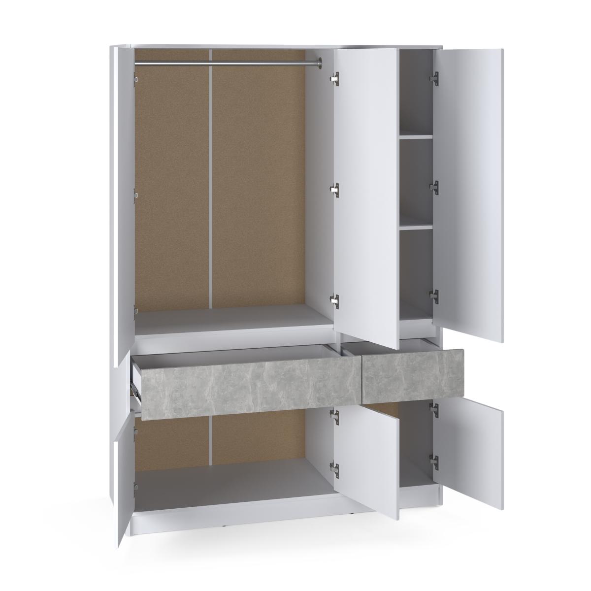 Шафа розподілена на секції для максимальної зручності: простора зона зі штангою для довгого одягу та верхньою полицею, відділення з регульованими полицями для взуття й аксесуарів, а також два глибокі висувні ящики для білизни та дрібних речей. Це дозволяє ефективно організувати простір навіть у невеликій кімнаті.