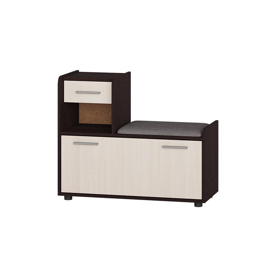 Тумба выполнена в сочетании цветов Венге тёмный и Дуб молочный, что создаёт выразительный контраст и визуально подчёркивает структуру мебели. Такое оформление гармонично вписывается в интерьер прихожей и сочетается с другой корпусной мебелью.