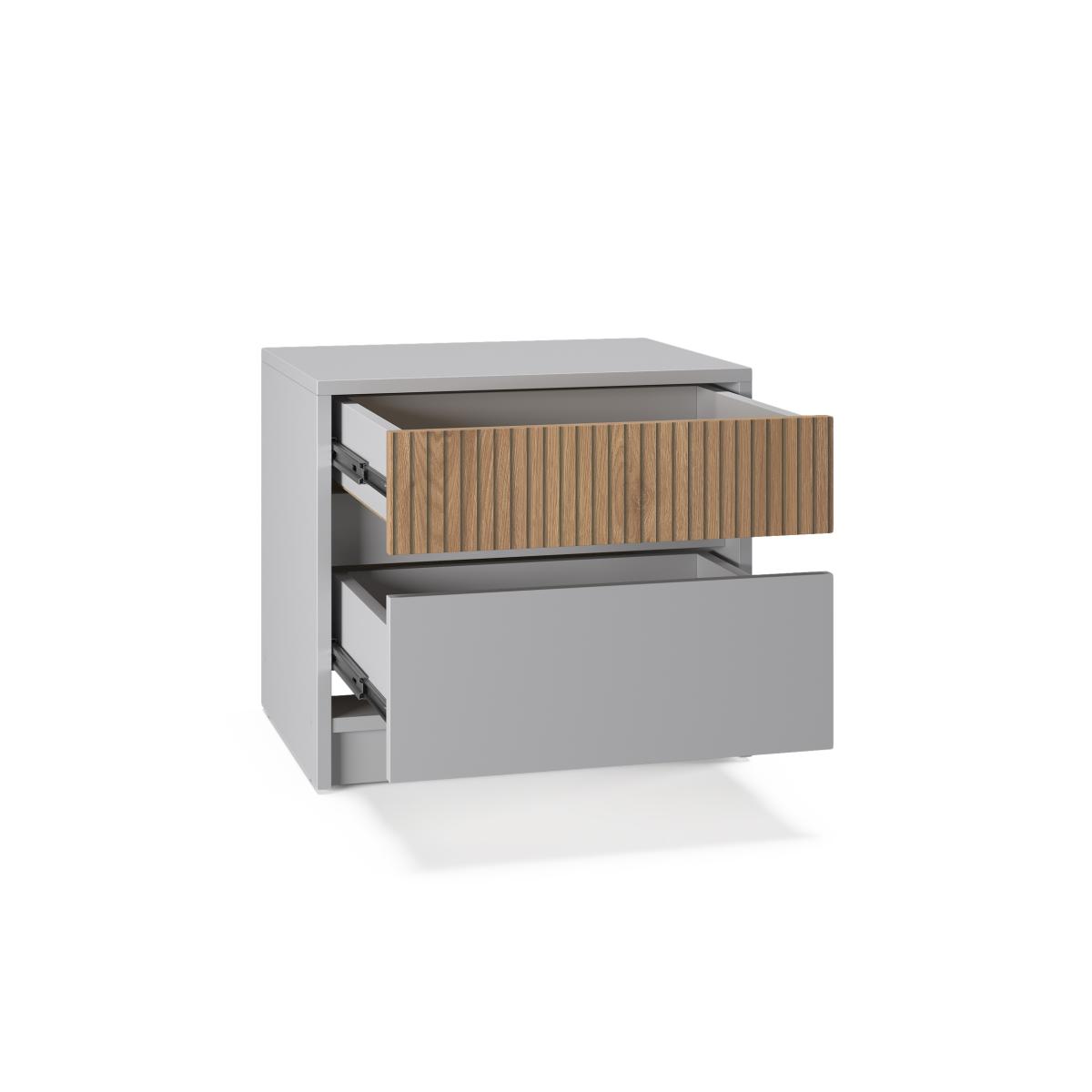 Тумба оснащена двома висувними ящиками на надійних телескопічних напрямних, які забезпечують плавний і безшумний хід. Верхній ящик (глибина 90 мм) зручний для зберігання аксесуарів, годинників, косметики чи особистих речей. Нижній ящик більш місткий (глибина 180 мм) ідеально підходить для книг, журналів, гаджетів, зарядних пристроїв та інших потрібних речей, які мають бути під рукою.