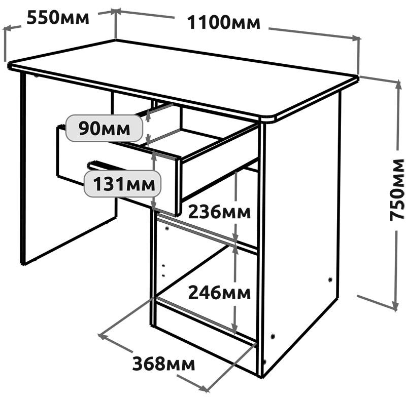 Стол оснащен правой тумбой с одной дверцей, за которой расположены две полки для хранения книг, учебных принадлежностей или канцелярии. Дополнительно предусмотрен один выдвижной ящик для мелких предметов. Модель не имеет тумбы под копьютер и полки под клавиатуру, что делает рабочую поверхность максимально свободной.