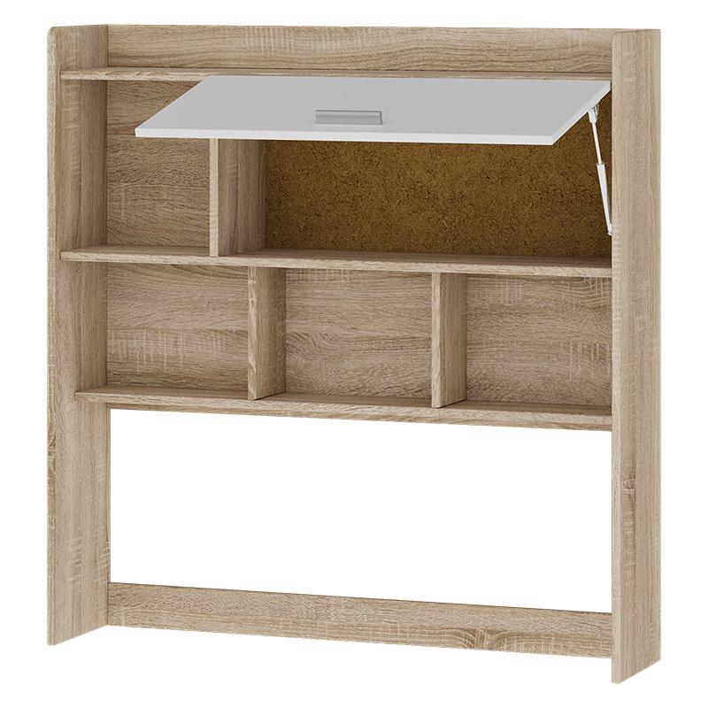 Надстройка оснащена шестью полками для удобного хранения книг, канцелярии, учебных принадлежностей и декоративных элементов. Одна из полок оборудована дверцей на подъемном механизме, которая открывается снизу вверх, обеспечивая легкий доступ к содержимому и безопасность использования.