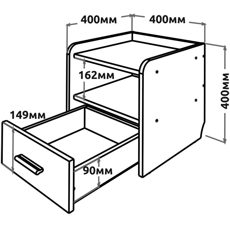 Тумба оснащена одним выдвижным ящиком для хранения мелких предметов, таких как очки, книги, пульты или канцелярия. Дополнительно предусмотрены две открытые полки для размещения декоративных элементов или вещей, к которым нужен быстрый доступ.
