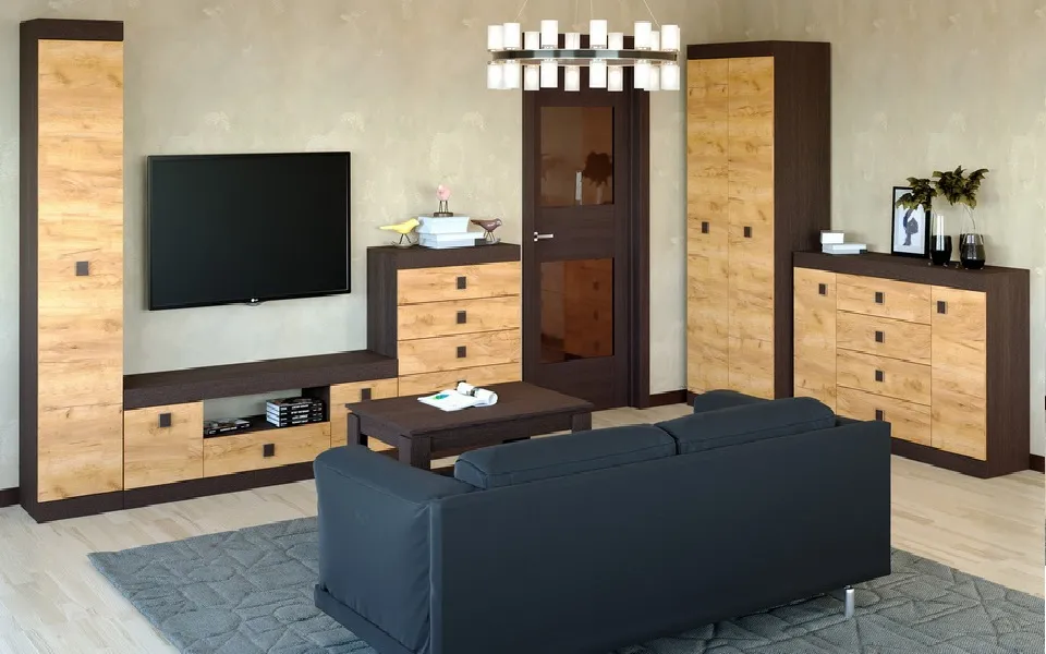 Стінка EVEREST Соната з нішею під ТВ, шухлядами та полицями 1600х376х1935 мм Венге темний + Дуб крафт золотий