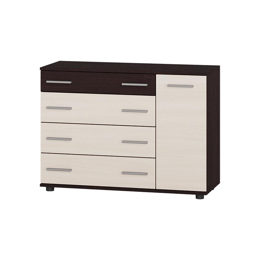 Конструкція комода включає кілька містких висувних ящиків і окреме відділення з розпашними дверцятами, що дозволяє зручно розподіляти зберігання одягу, білизни, аксесуарів, документів та інших побутових речей.