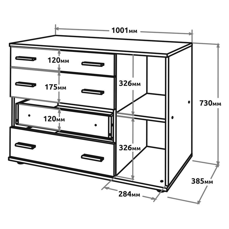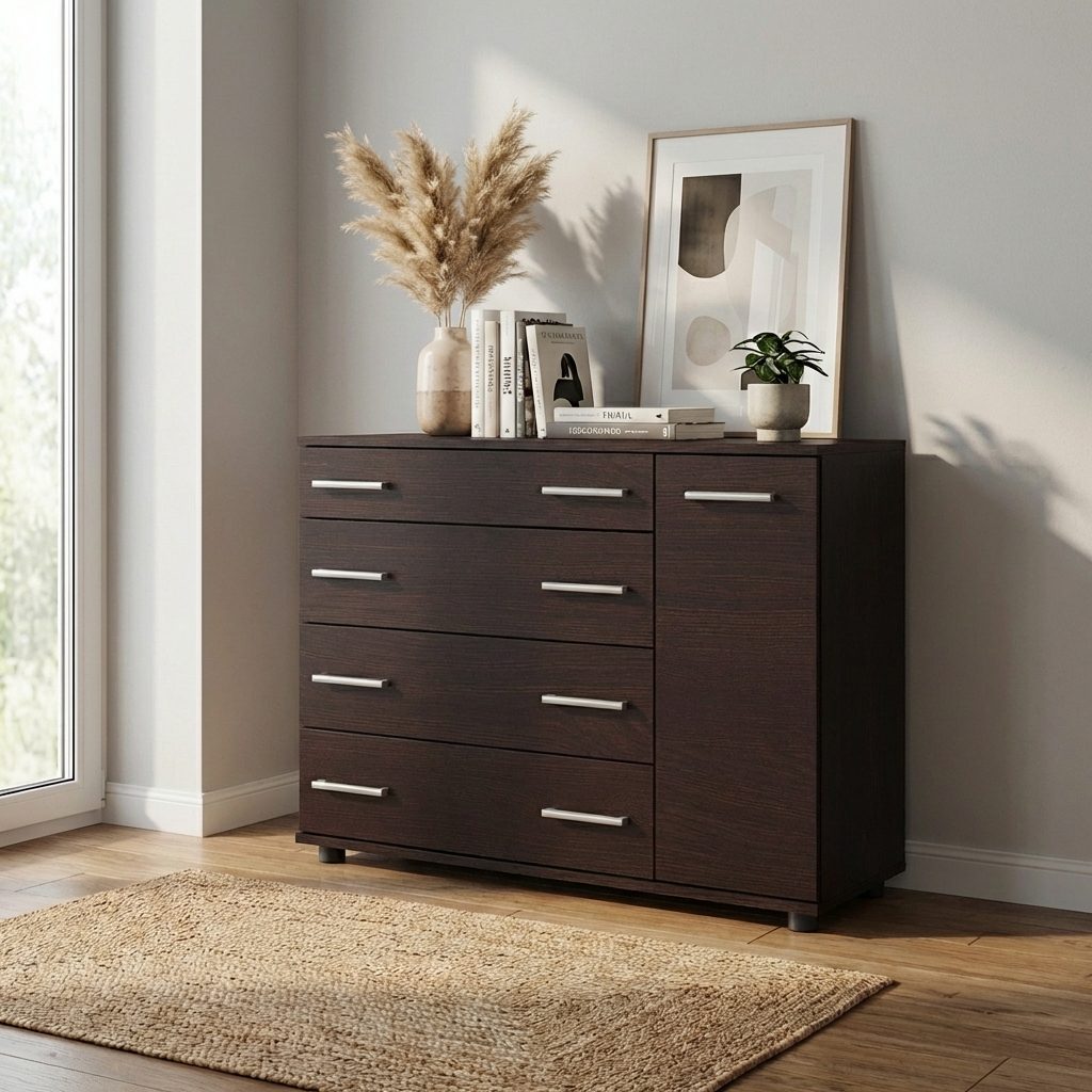 Комод забезпечує зручну організацію зберігання завдяки поєднанню висувних ящиків і закритого відділення. Ящики підходять для білизни та одягу, а секція з дверцятами — для більш габаритних або рідко використовуваних предметів. Верхня поверхня може використовуватися для розміщення декору, дзеркала або повсякденних речей.