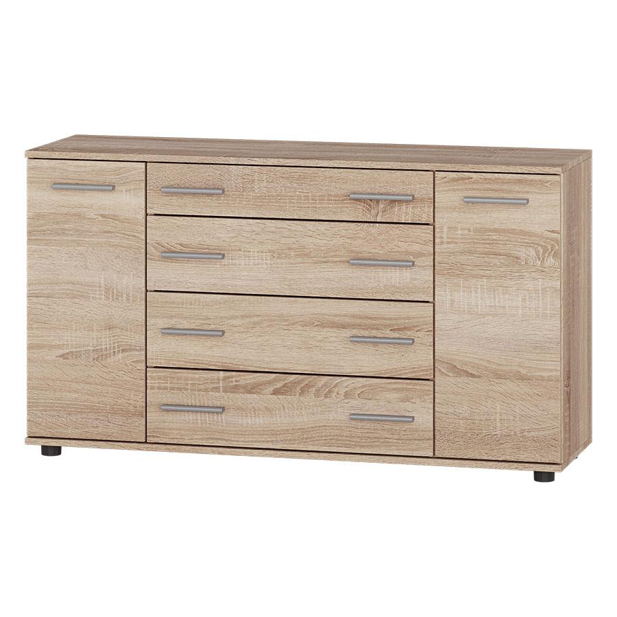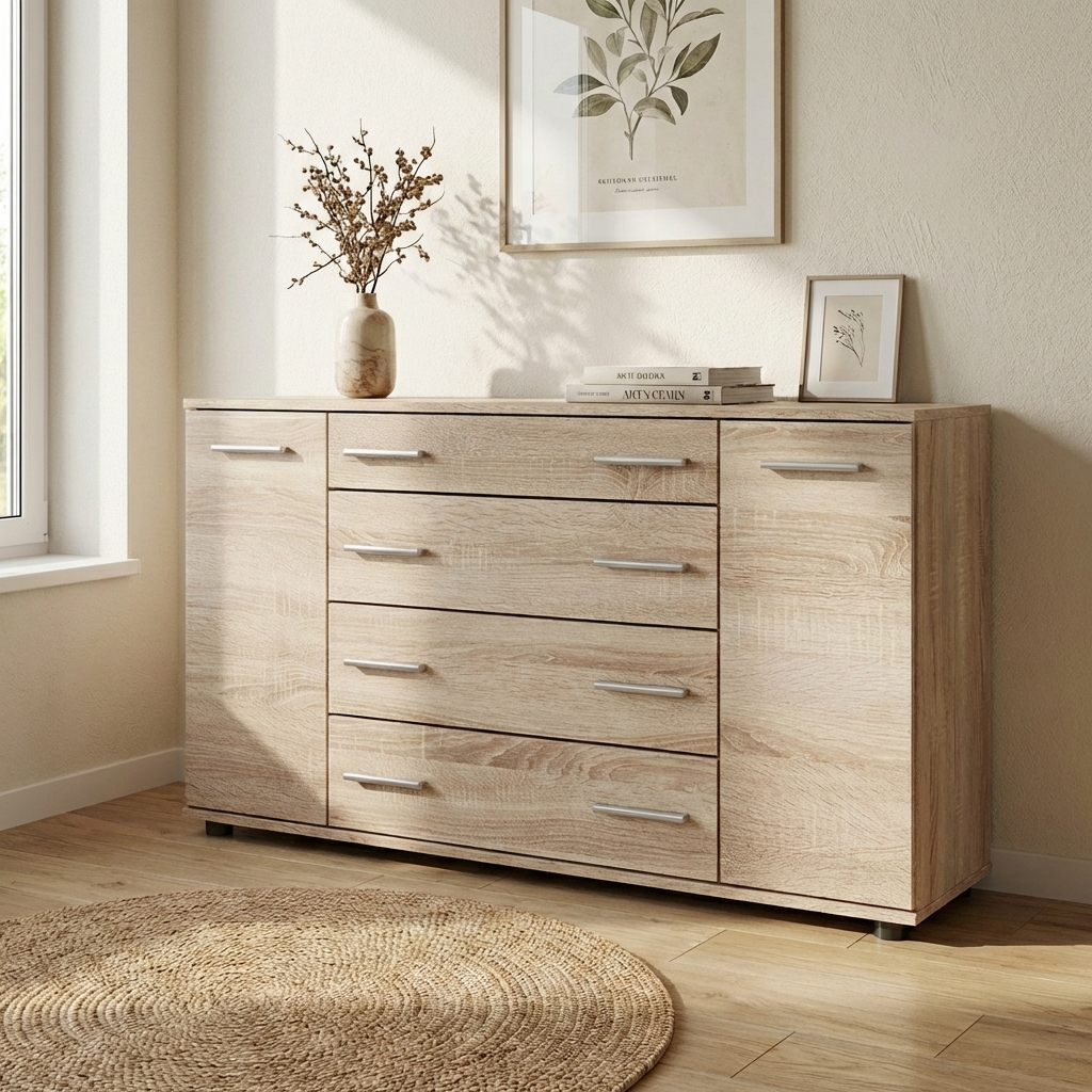 Комод забезпечує зручну організацію зберігання завдяки поєднанню висувних ящиків і закритих бокових відділень. Ящики підходять для білизни та одягу, а секції з дверцятами — для більш габаритних або рідко використовуваних предметів. Верхня поверхня може використовуватися для розміщення декору, дзеркала або повсякденних речей.