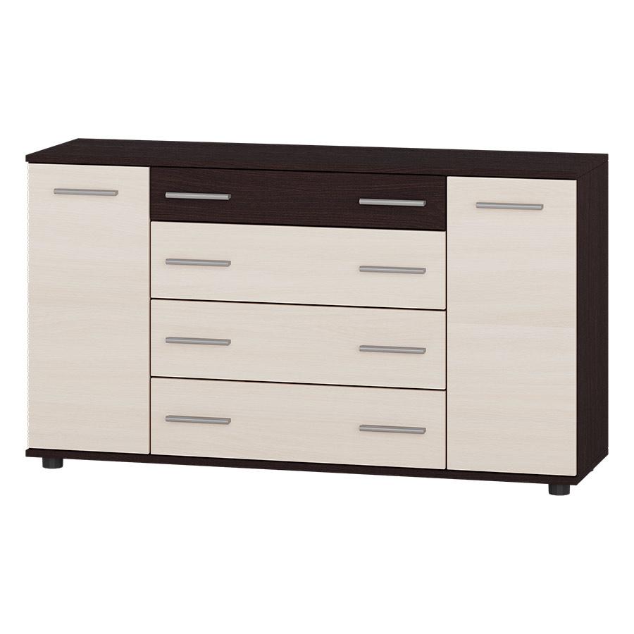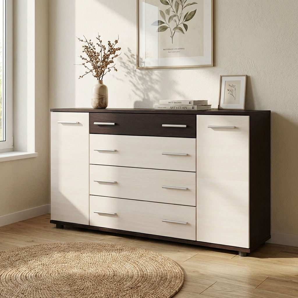 Комод забезпечує зручну організацію зберігання завдяки поєднанню висувних ящиків і закритих бокових відділень. Ящики підходять для білизни та одягу, а секції з дверцятами — для більш габаритних або рідко використовуваних предметів.