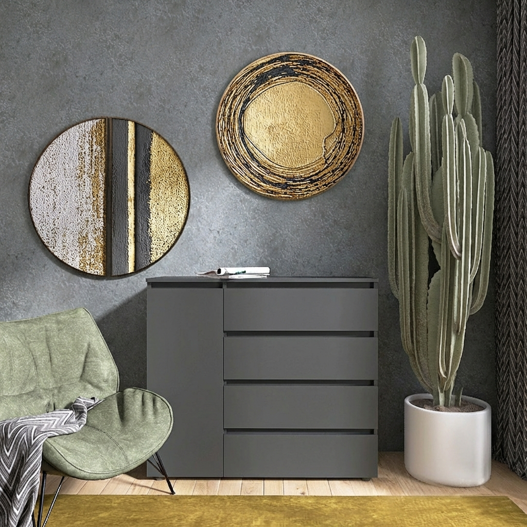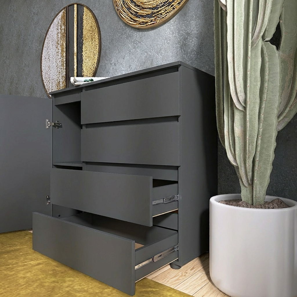 Цей компактний, але просторий комод легко впишеться в будь-який інтер'єр, чи то сучасний мінімалізм, класика чи скандинавський стиль. Завдяки чітким лініям і стильним фасадам він додасть нотки затишку та елегантності у вашу спальню, вітальню або передпокій.