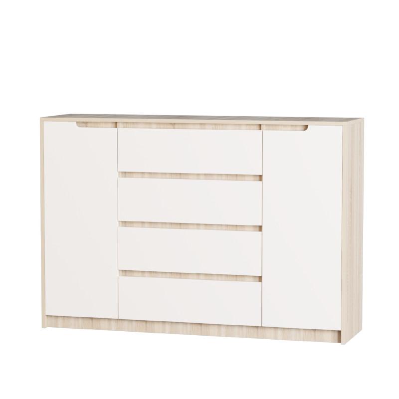 Комод EVEREST Мікс-3 1405×385×977 мм Сонома + Білий оснащений чотирма висувними шухлядами та двома розпашними дверцятами з полицями. Шухляди зручні для зберігання одягу, білизни та дрібних речей, а відділення за дверцятами підійдуть для коробок, книжок, посуду та текстилю.