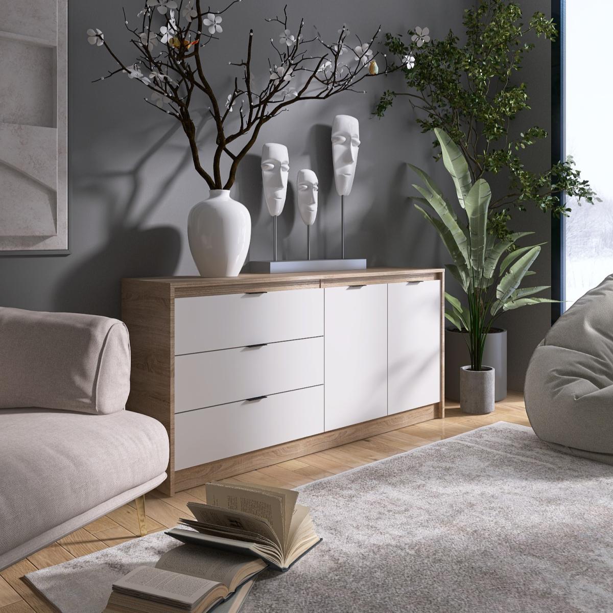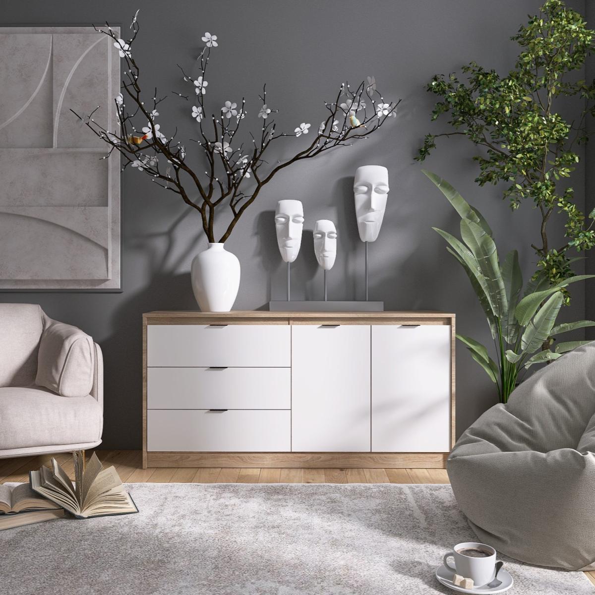 Комод EVEREST Сіті — це місткий і сучасний елемент інтер’єру, що поєднує функціональність і мінімалістичний дизайн. Модель ідеально підійде для вітальні, спальні або передпокою. Комод у кольорі Сонома + Білий легко поєднується з іншими меблями, а зручна конструкція з трьома висувними шухлядами та двома секціями з полицями за розпашними фасадами дозволяє ефективно організувати зберігання речей.