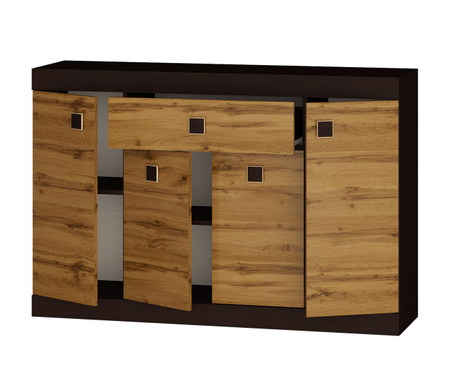 Орієнтований на збільшену кількість розпашних дверцят, включає три ніші з полицями і одну висувну шухляду.