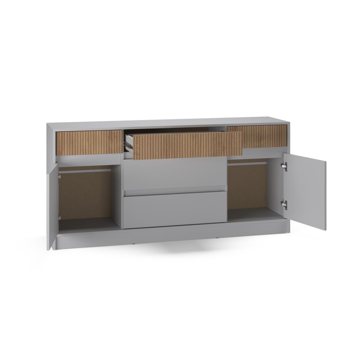Комод оснащён тремя выдвижными ящиками разной глубины (150, 200 и 110 мм), двумя распашными дверцами с вместительными отделениями (высота 440 и 411 мм), а также открытой нишей для дополнительного хранения (глубина 424 мм). Ящики снабжены надёжными телескопическими направляющими, обеспечивающими плавное и тихое открытие даже при интенсивной эксплуатации. Такая конфигурация позволяет удобно хранить одежду, текстиль, аксессуары, документы, книги и бытовые мелочи.
