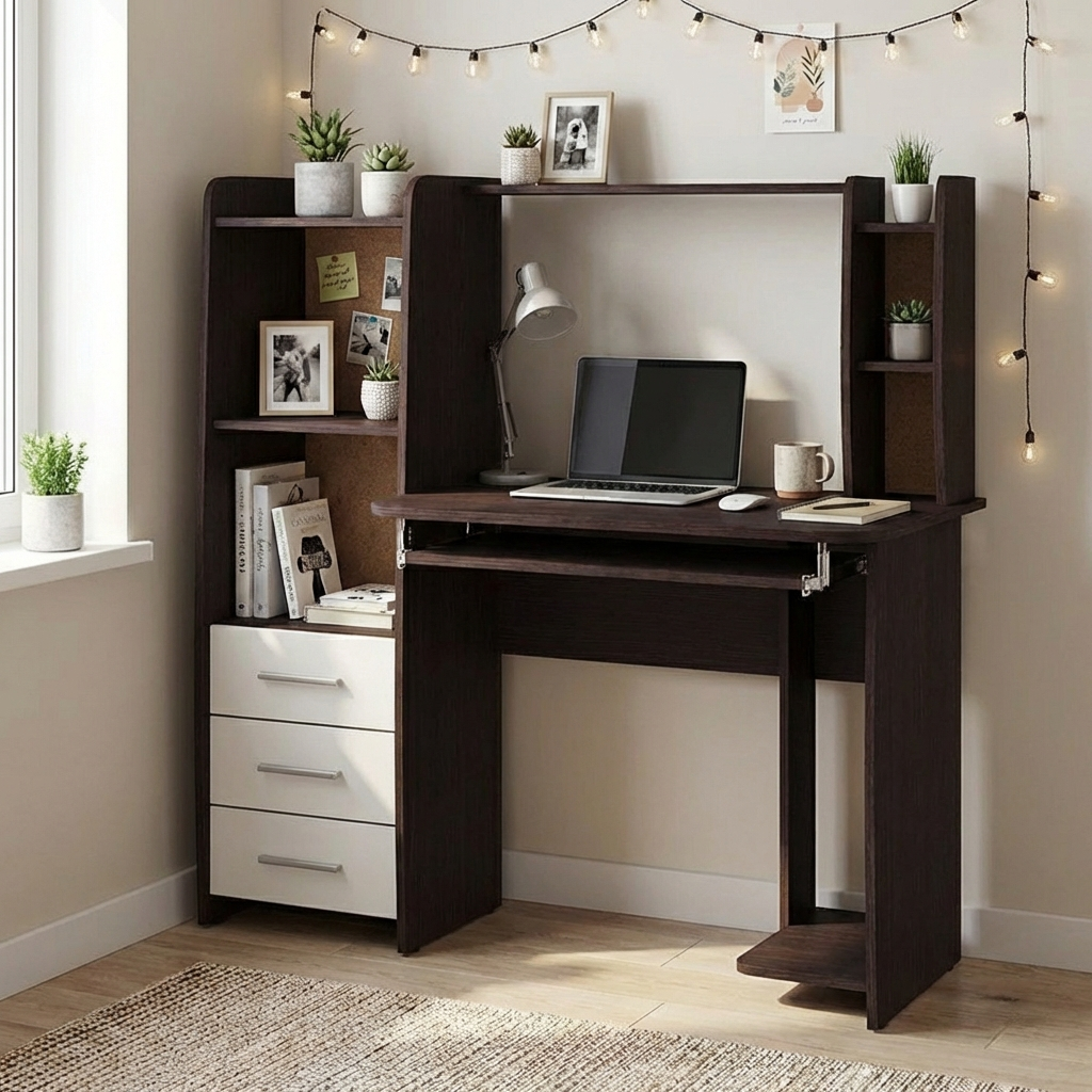 Стіл оснащений тумбою з ящиками для канцелярії та документів, полицями для книг і декору, а також просторою стільницею для комфортної роботи за комп’ютером або виконання навчальних завдань.
