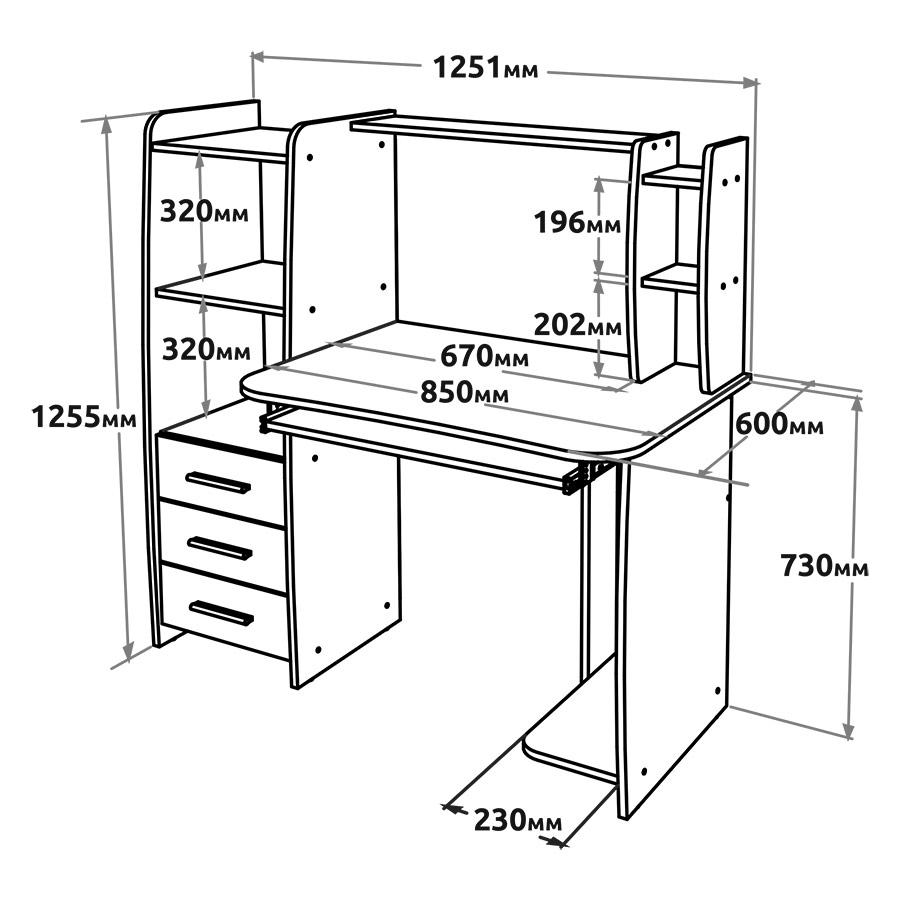 Конструкція передбачає тумбу з висувними ящиками, розташовану з лівого боку, простору робочу поверхню, надбудову з полицями для книг і навчального приладдя, а також додаткові ніші для зберігання. Це дозволяє зручно організувати робоче місце та підтримувати порядок.