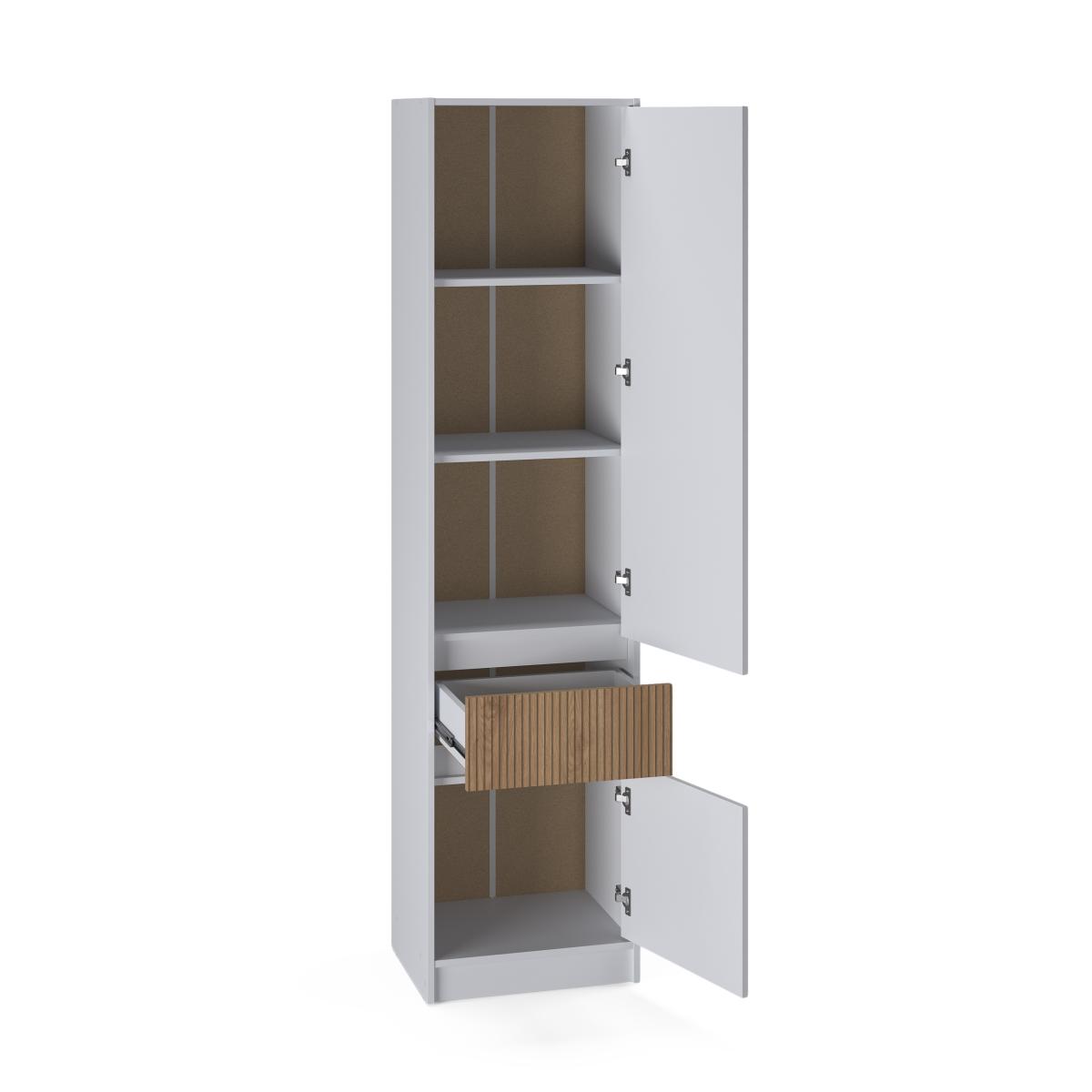 Пенал оснащений чотирма місткими полицями та однією висувною шухлядою на телескопічних напрямних (глибина шухляди 120 мм), що ідеально підходить для зберігання документів, книг, білизни, одягу чи побутових дрібниць. Полиці різної висоти (393, 381, 386, 384 мм) дозволяють розмістити як великі, так і дрібні предмети. Нижній відсік зачиняється дверцятами, що зручно для зберігання особистих речей та підтримання порядку.