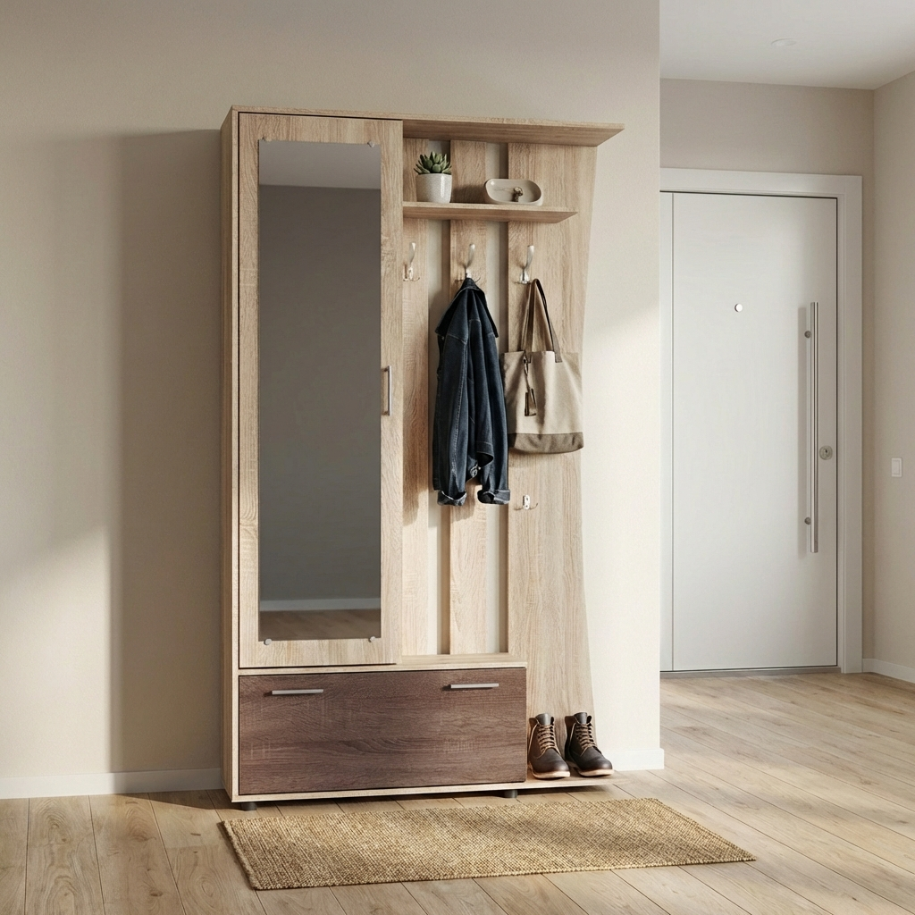 Передпокій EVEREST АВЕО-2 — функціональний та компактний меблевий комплект для передпокою, створений для зручної організації зберігання верхнього одягу, взуття та аксесуарів. Модель підходить для квартир і будинків з обмеженим простором.