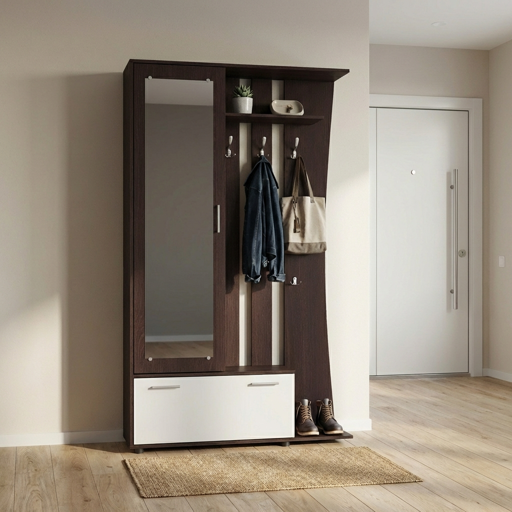 Компоновка включає шафу з дзеркальними дверцятами, відкриту вішалку з гачками для верхнього одягу, верхню полицю для головних уборів і нижній висувний ящик для взуття або сезонних речей. Дзеркало візуально розширює простір і підвищує функціональність передпокою.