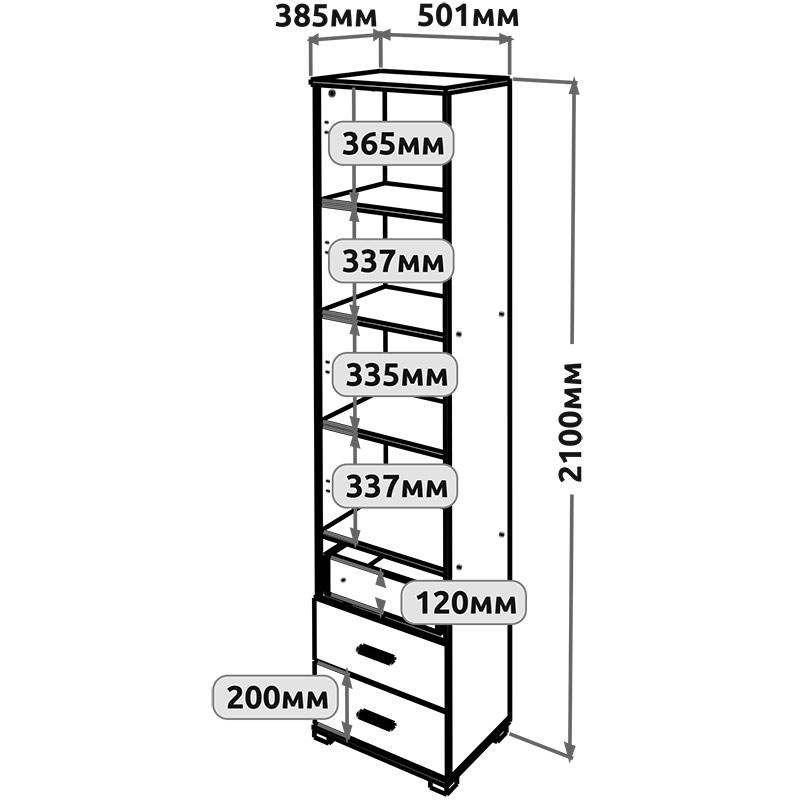 Шафа оснащена одними дверима на петлях. Внутрішній простір включає чотири полиці, три з яких виконані у вигляді висувних. Така конструкція забезпечує зручний доступ до вмісту та дозволяє раціонально зберігати одяг, взуття, коробки, документи або господарські предмети.