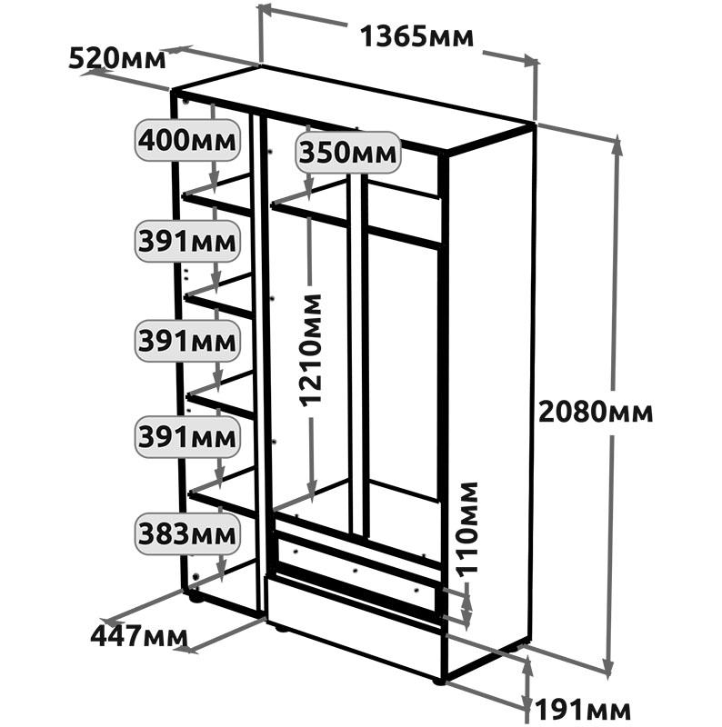 Ліве відділення – вертикальний пенал із вбудованими місткими полицями для дбайливого зберігання речей.