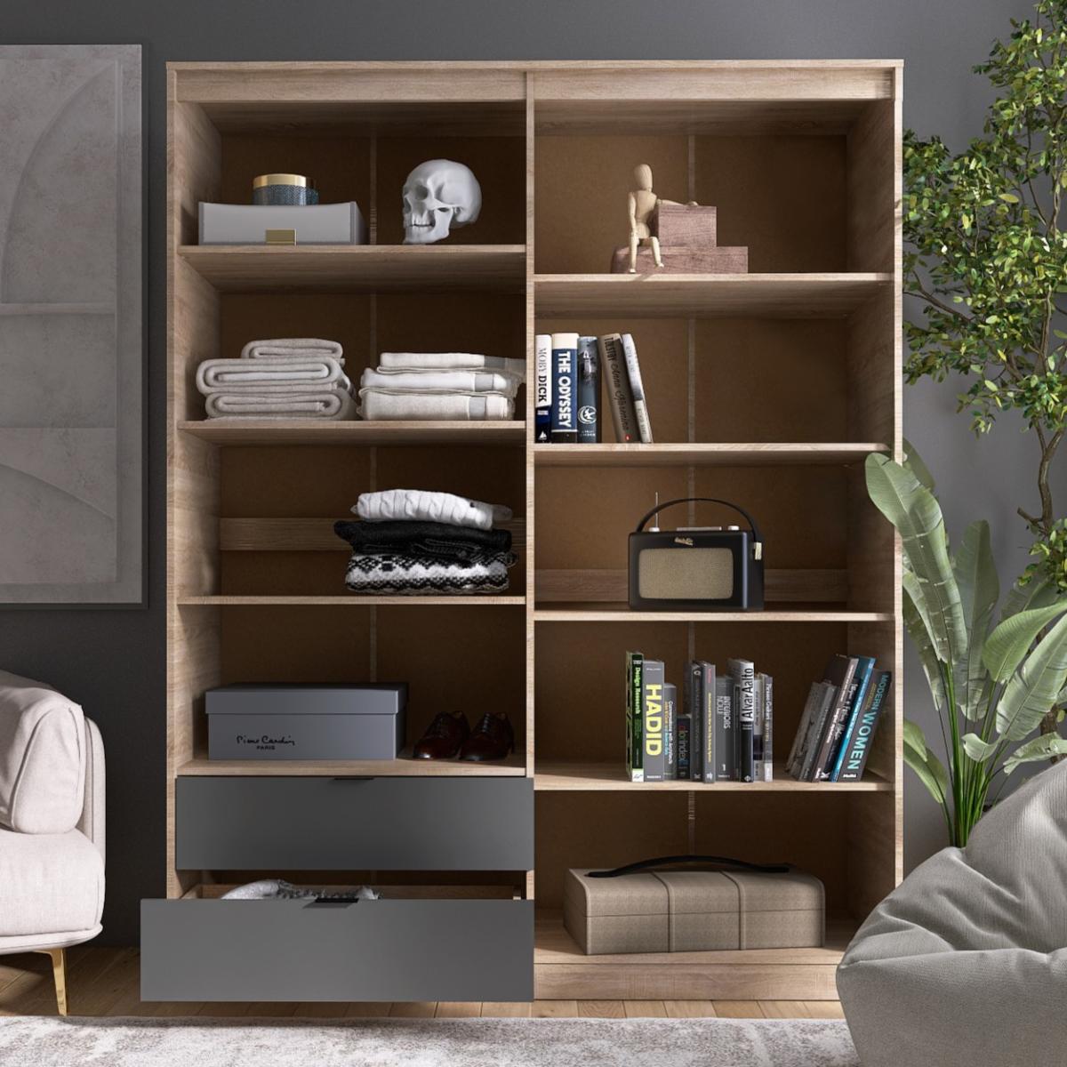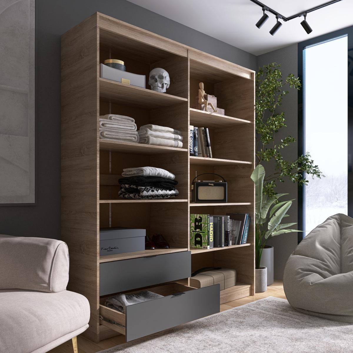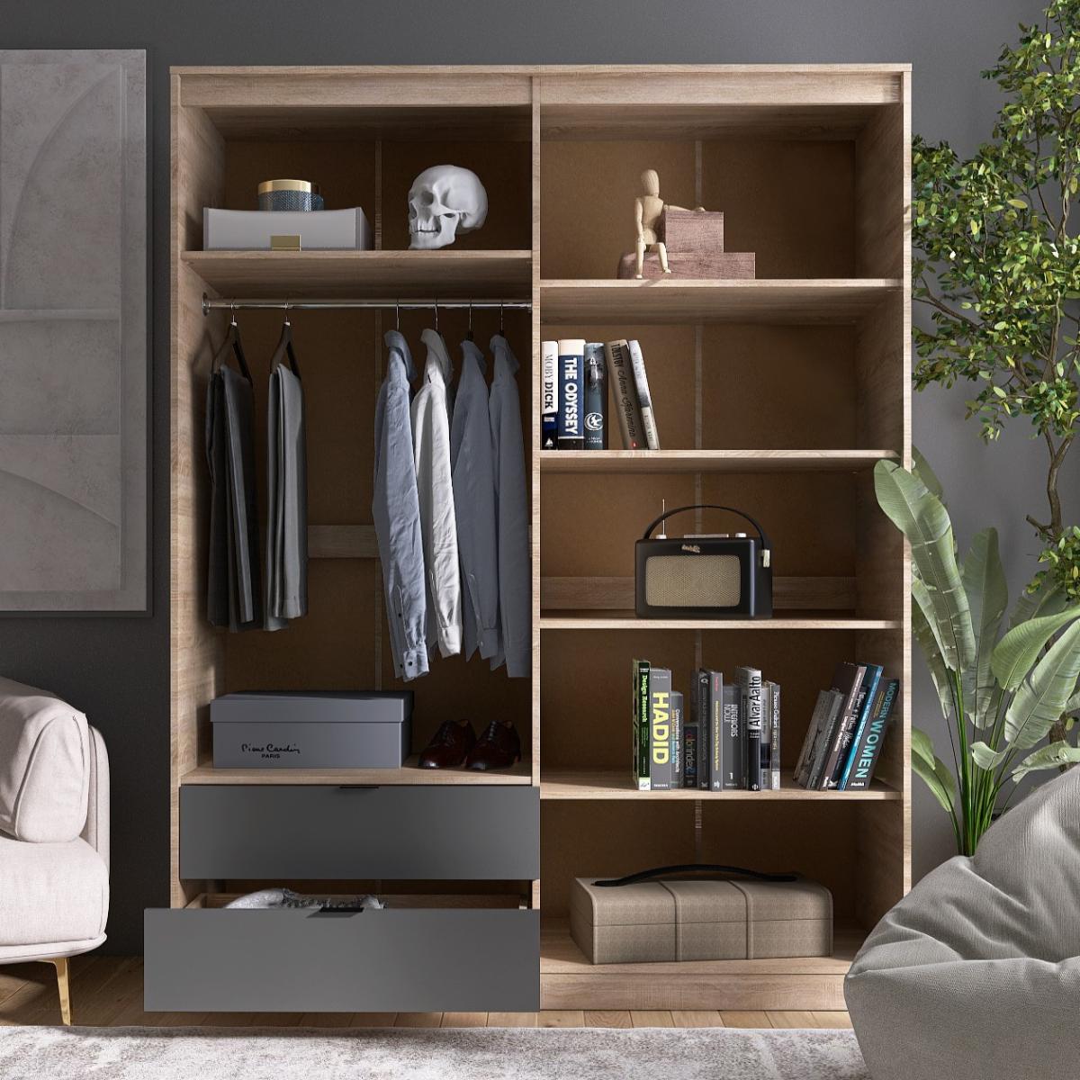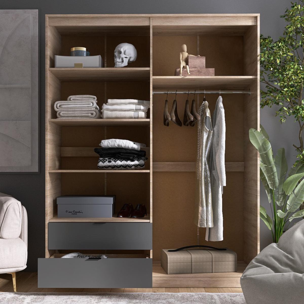 Шафа EVEREST Сіті 1600 — простора та функціональна шафа, створена для зручного зберігання одягу та аксесуарів у спальні, гардеробній або передпокої. Модель виконана у елегантному поєднанні корпусу кольору Сонома та матових фасадів в кольорі графіт, що забезпечує стильний і сучасний вигляд.
