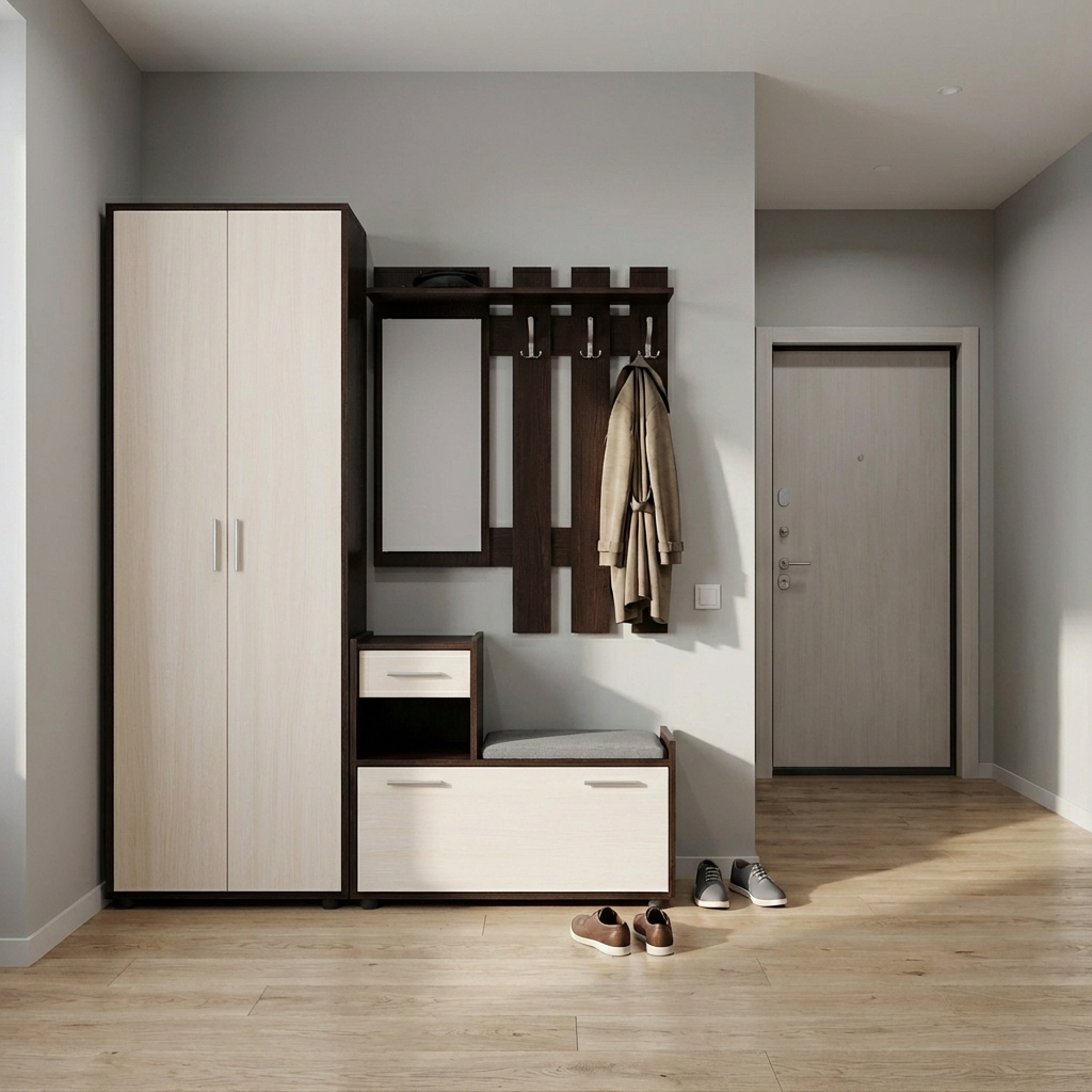 Корпус из ЛДСП обеспечивает жёсткость и устойчивость конструкции при ежедневной эксплуатации. Модель рассчитана на регулярное использование в прихожей.