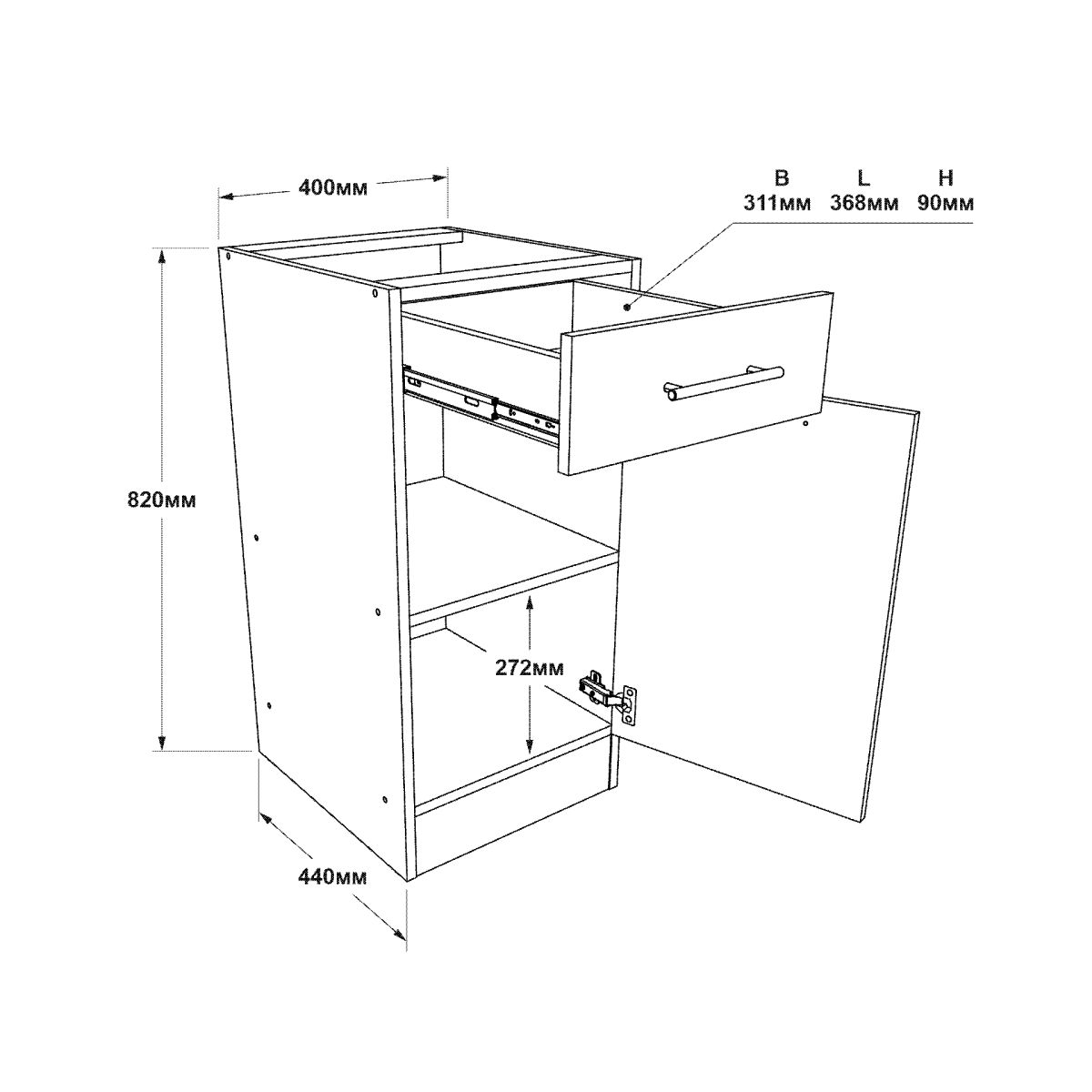 Використовується надійна металева фурнітура для довговічної роботи дверцят і шухляди.
