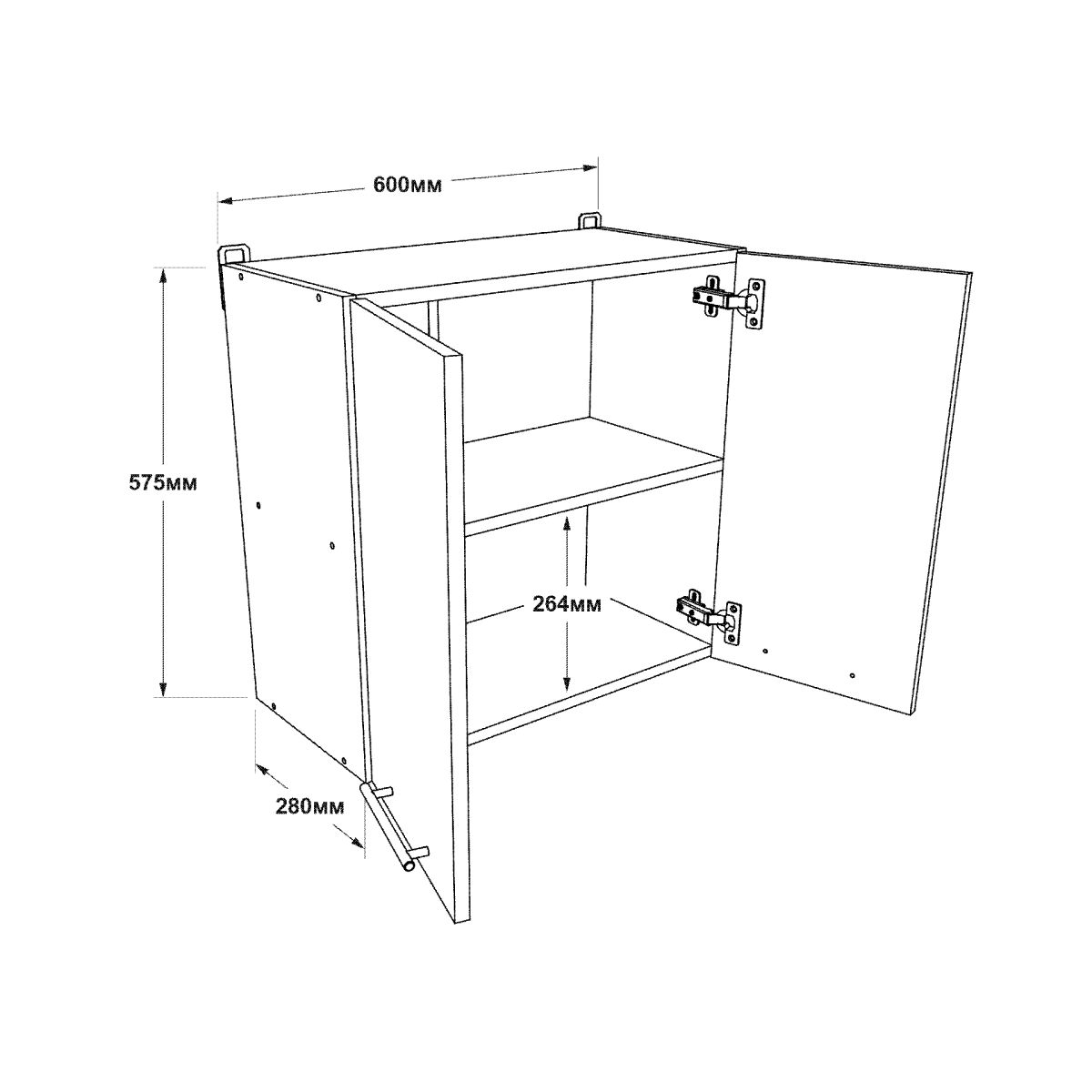 Завдяки компактним розмірам 600×575×280 мм шафа зручно розміщується у верхньому ряду меблів і допомагає раціонально використовувати простір кухні.