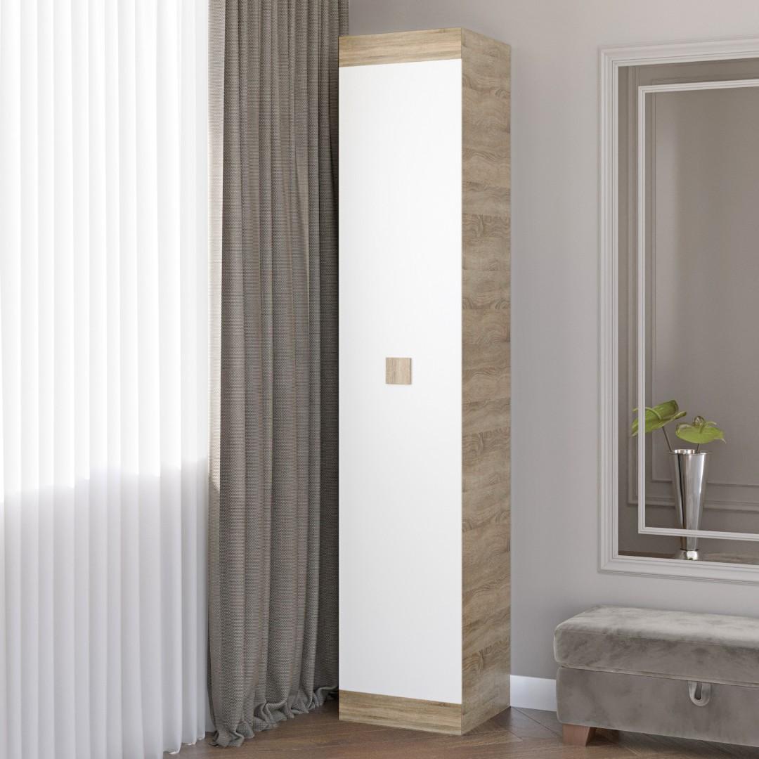 Закритий пенал із колекції Соната – це сучасне та практичне рішення для організації зберігання у вітальні, спальні, передпокої, домашньому кабінеті чи офісі. Завдяки поєднанню глибокого відтінку Сонома + Білий, меблі виглядають стильно та легко вписуються в будь-який інтер’єр.